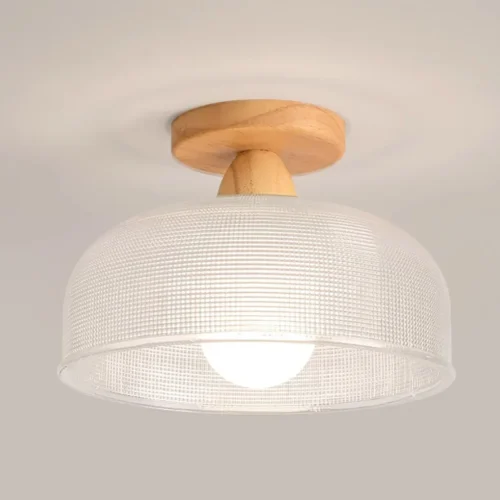 Luminária De Sobrepor Redonda De Vidro e Base Textura Madeira